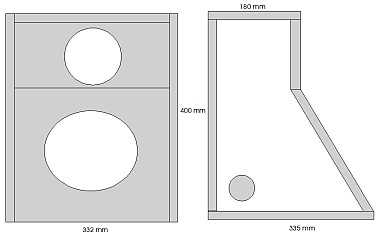 KIT "de Scheeve" für 240,00 Euro besteht aus :2 * Tiefmitteltöner Dayton Audio SIG 1802 * Hochtöner Peerless XT25SC9-04 2 * Weichenbauteile 2 * Terminal mit Polklemmen 2 * Dichtungsband, selbstklebend, 2*5 mm 2 * Bassreflexrohr 2 * Dämmaterial 2 * Kabel 2*1,5 rot/schwarz 2 * Schrauben schwarz Die Abstufung infolge der Schräge der Schallwand vermeidet den sonst üblichen zeitlichen Versatz zwischen Hochtöner und Tiefmitteltöner. |